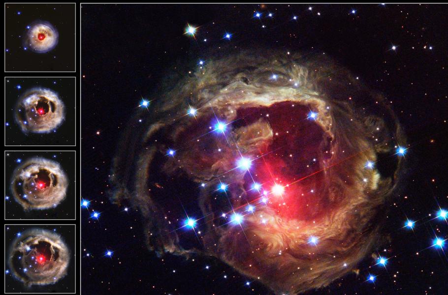 Světelné echo proměnné hvězdy V838 Monocerotis v souhvězdí Jednorožce. Pochází náhlé zjasnění ze srážky stálic v těsném systému?