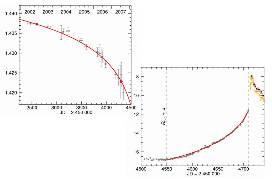 Poté už události nabraly rychlý spád: Slapové síly roztrhaly plynný obal méně hmotné hvězdy a ten se následně přeměnil v akreční disk kolem hmotnější stálice. Jádro méně hmotné složky se v utvořeném disku účinně brzdilo a spirálovalo na hmotnější komponentu. Během brzdění se disk intenzivně ohříval a hvězda zjasňovala. Jakmile obě jádra splynula, zažehla se překotná termojaderná reakce a zdánlivá jasnost systému vzrostla téměř o sedm magnitud – zářivý výkon se tedy zvýšil o víc než čtyři řády.
