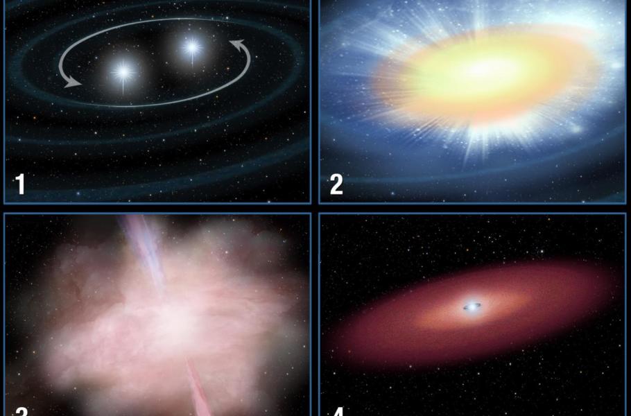 Průběh samotného splynutí bude záviset na poměru hmotností obou hvězd. Budou-li jejich hmoty srovnatelné, začnou si oběžnice v určité fázi hmotu intenzivně vyměňovat a vznikne společná obálka, jež urychlí jejich pád; nakonec se z oblaku naporcovaného materiálu zformuje nová hvězda, která bude jasnější než její předchůdkyně. Pokud bude hmotnost jedné složky výrazně vyšší, spíš než ke splynutí stálic dojde k postupnému slapovému naporcování méně hmotné hvězdy: Nejprve se z ní vytvoří akreční disk okolo hmotnější složky, a i ten bude posléze nejspíš pohlcen. Nabalování materiálu z disku povede k prudkému zjasnění systému.