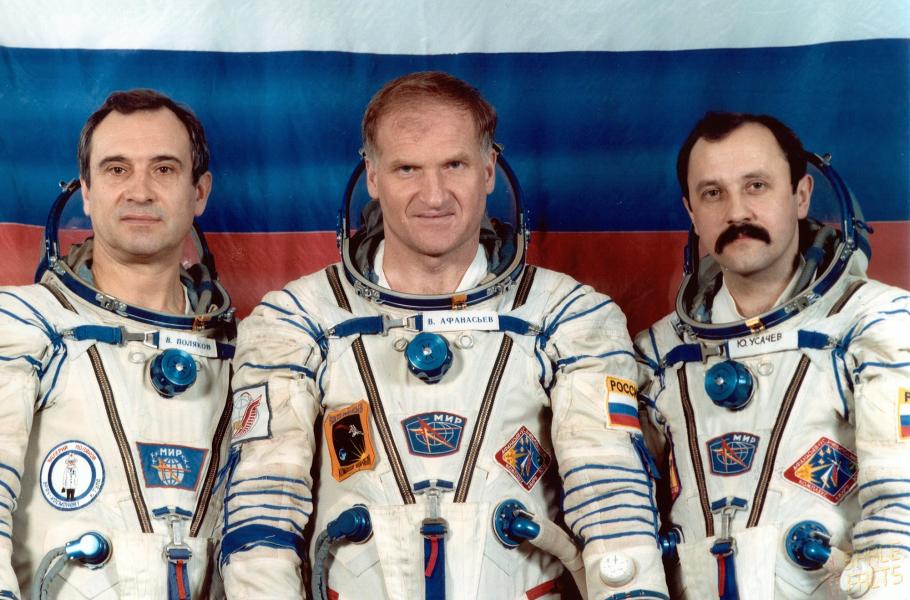 Posádka letu TM-18: Poljakov, Afanasjev a Usačov. Poljakov strávil ve vesmíru skoro 438 dnů