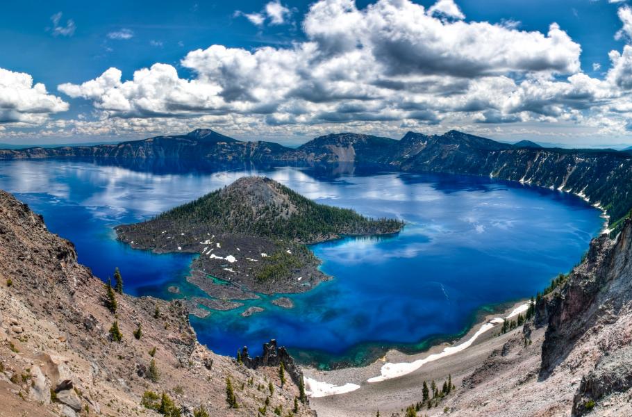 Kolapsem sopky vzniklo rovněž Kráterové jezero v americkém Oregonu – jeho vody nicméně nepředstavují smrtelné riziko jako v případě indonéského Kawah Ijen. Naopak, jsou chladné a čisté, a vytvářejí tak ideální podmínky nejen pro ryby: Vodní plochu totiž už od roku 1896 křižuje také kmen stromu přezdívaný Old Man, kterému zima brání v rozkladu. Kráterové jezero nemá žádné říční přítoky a „žije“ pouze z deště či tajícího sněhu. Přesto vědci odhadují, že se jeho vody zcela obmění jednou za 250 let v důsledku odpařování. (foto: Shutterstock)