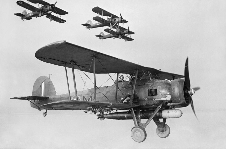 Formace letounů Fairey Swordfish Mk.I s podvěšenými torpédy během cvičného letu v roce 1940.