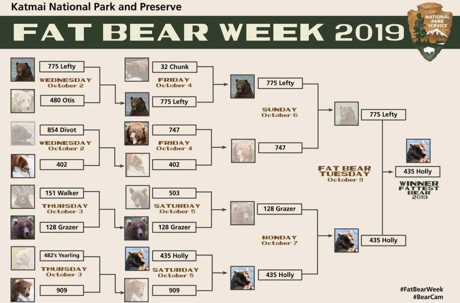 Aljašský Katmai National Park uspořádal na své facebookové stránce hlasování o nejúžasnějšího a nejtlustšího medvěda grizzlyho na území rezervace. Tamní pracovníci soutěž podpořili fotografiemi celkem 12 uchazečů o prvenství, mezi nimiž nakonec rozhodlo 187 tisíc hlasů veřejnosti.