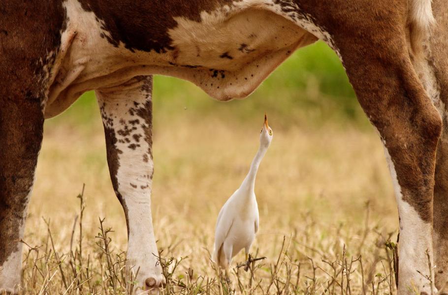 Volavka rusohlavá (Bubulcus ibis) je patrně nejběžnější volavkou žijící v tropech. Osobně jsem se s ní setkal v Thajsku, v Gambii a naposledy v Belize. Na rozdíl od ostatních volavek ji najdete především na pastvinách, kde je vždy obklopena stádem krav nebo koňů. V Africe slouží volavce jako „doprovod“ také nosorožci, buvoli a další zvířata. Všichni mají stejnou roli – svou chůzí plaší hmyz a drobné obratlovce, kteří se stávají kořistí volavek. Pro krávy jsou však volavky také užitečné. Zbavují je obtížného hmyzu, který se na ně stále lepí. Krávy jsou v tu chvíli velmi tolerantní a pouští opeřence hluboko do své „osobní zóny“. Navíc tito ptáci chrání stádo před vetřelci. Zdálo by se, že je snadné se k volavkám a stádu krav přiblížit a prostě zmáčknout spoušť. Jenže volavky rusohlavé jsou dost plaché. Jakmile přijdete moc blízko, okamžitě se zvednou a odletí. Krávy jejich odlet vnímají jako signál nebezpečí a celé stádo se ihned vzdálí.