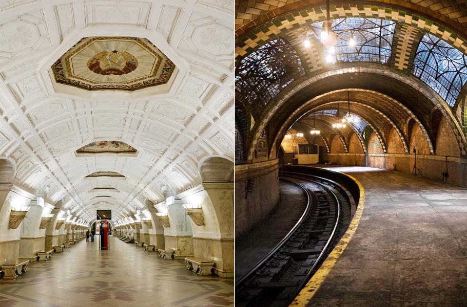 City Hall station (vpravo) je jedním z klenotů newyorského metra. Stanice Bělorusskaja (vlevo) je typickým příkladem sovětského stylu veřejné architektury