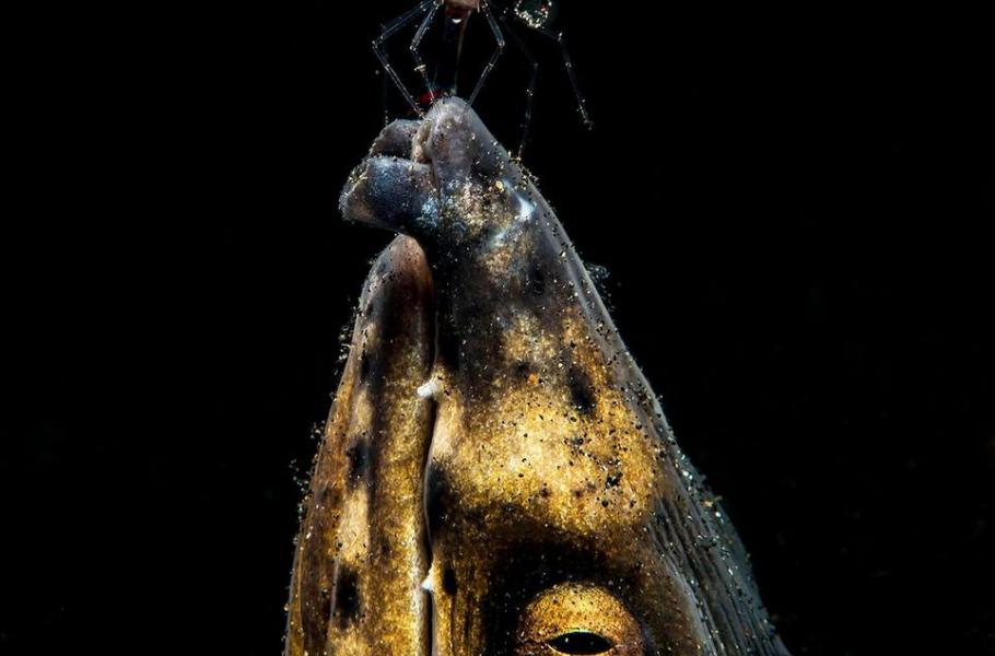 Giacomo Marchione pořídil svůj snímek v oblíbené potápěčské destinaci TK3 v Indonésii: Zničehonic se mu před objektivem začal ze dna klubat hadař pruhohlavý. Na špičce hlavy se mu přitom udržela odvážná kreveta, jež posléze zapózovala jako rozená akrobatka.