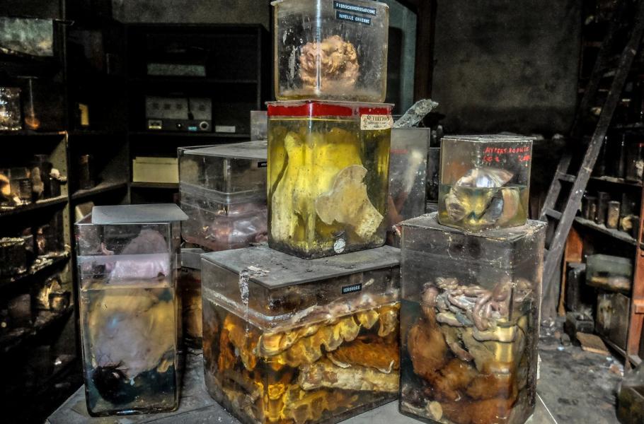 Když padlo rozhodnutí přestěhovat v roce 1991 belgickou veterinární školu z Anderlechtu do Lutychu, nikdo netušil, jaká zůstane v opuštěných laboratořích spoušť. Regály se prohýbají pod nádobami s mrtvými zvířaty, a interiéry někdejší instituce tak připomínají kulisy z hororu.