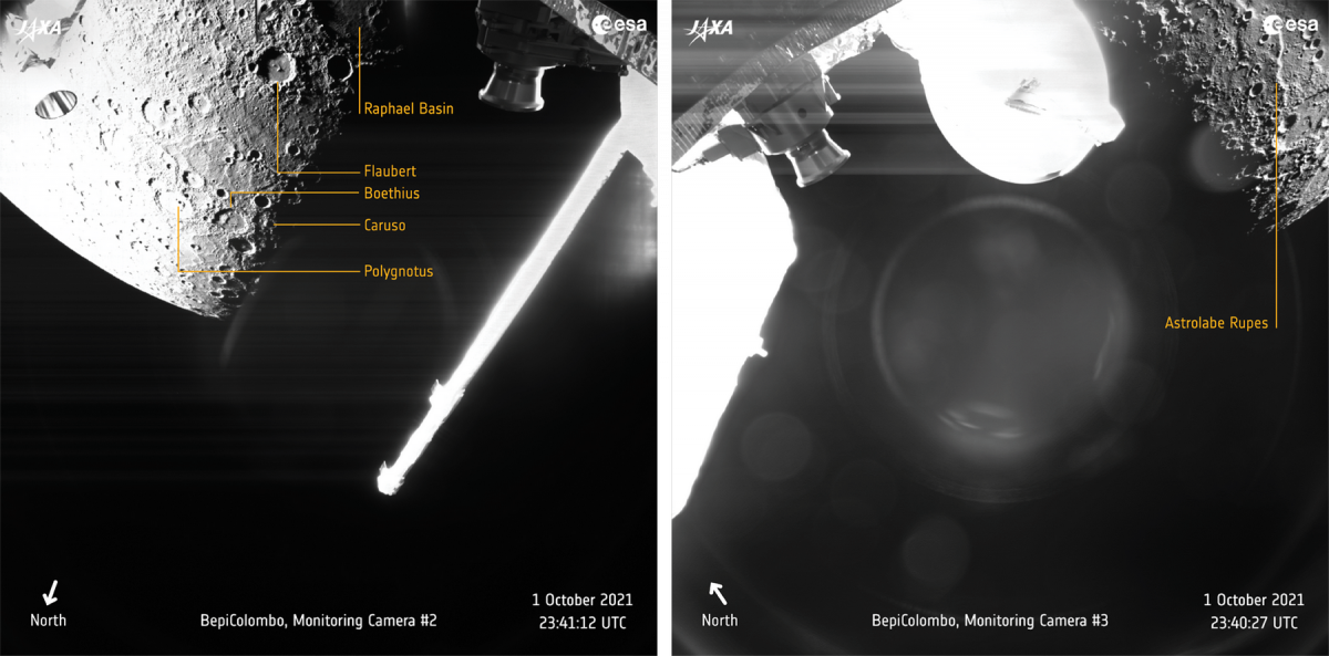 Vpravo východ slunce nad zlomem Astrolabe Rupes, zachycený ze vzdálenosti 1 183 km od povrchu planety, vlevo 342 kilometry velký kráter Raphael ze vzdálenosti 1 410 kilometrů. (foto: ESA/BepiColombo/MTM, CC BY-SA 3.0 IGO)