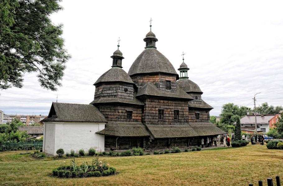 Na polsko-ukrajinském pomezí se dochovalo šestnáct dřevěných kostelů a polovina z nich se nachází na území Ukrajiny. Všechny vznikly mezi 16. a 19. stoletím a vybudovaly je řecké a východní ortodoxní komunity. Sloh „cerkví“ se tudíž navzájem podobá, přičemž vysoké střechy a rozložité zvonice mají vydržet karpatské sněhové bouře. Snímek zachycuje kostel sv. Trojice v Žovkvě. (foto: Wikimedia Commons, Sergіjj Krinicja, CC BY-SA 3.0)