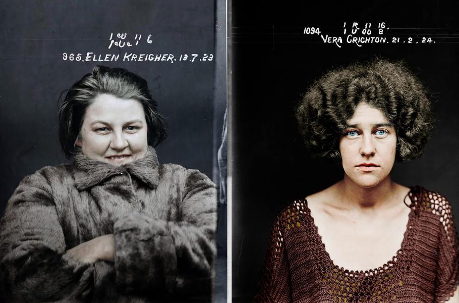 Třiadvacetiletá Vera Crichtonová (vpravo) byla roku 1924 zadržena proto, že domlouvala pro jinou ženu nelegální potrat. Vlevo Ellen Kreigherová, která byla roku 1923 odsouzena za vraždu.