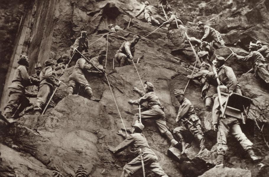 Boj na alpských vrcholcích představoval problém a obě strany tak využívaly „horské jednotky“. Fotografie dokládá, jak obtížný terén museli tito muži zdolávat a v jakém prostředí se odehrával boj s Italy.