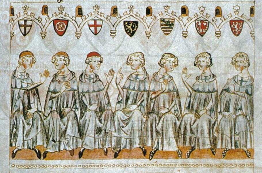 Kurfiřti volí Jindřicha VII. římským králem. Zleva (podle znaků): arcibiskupové kolínský, mohučský a trevírský, falckrabě rýnský, vévoda saský, markrabě braniborský, král český. (ilustrace: Wikimedia Commons, CC0)