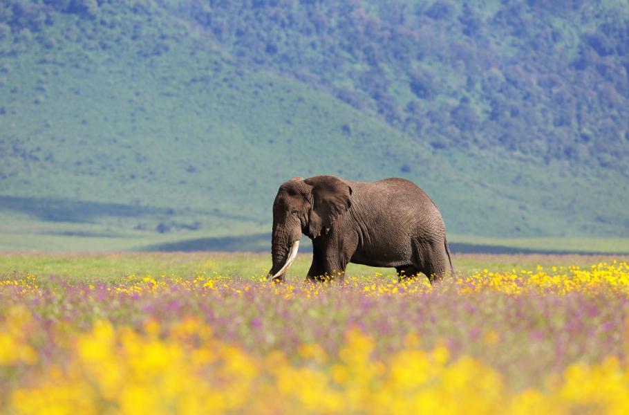 Slon africký je největší suchozemský savec na Zemi. V rozkvetlém kráteru žije několik skupin slonů afrických, kteří tady díky přísné ochraně dorůstají úctyhodných rozměrů. Ze stejného důvodu jsou velmi vzrostlé i kly těchto gigantických savců.