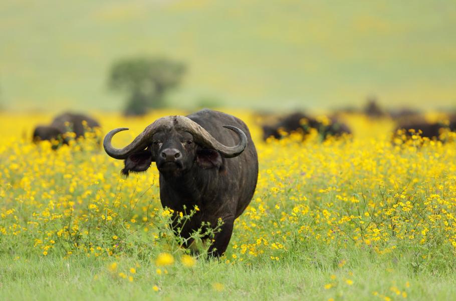 Buvol africký patří k nejnebezpečnějším zvířatům Afriky a nezalekne se ani smečky lvů. V kráteru jsme byli svědky toho, jak statní býci chránili mláďata před útokem mladé samice lva, které se před útočícími buvoly dala na okamžitý ústup.