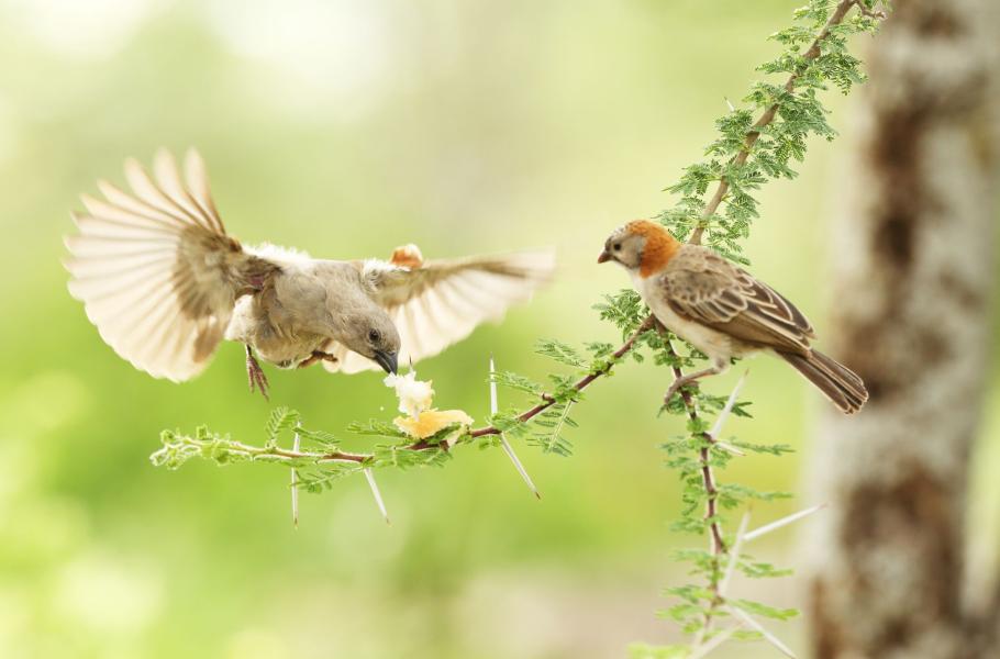 Na okraji kráteru v blízkosti posledního kousku primárního lesa žije typický i obyvatel afrických savan a lesů, vrabec sahelský.