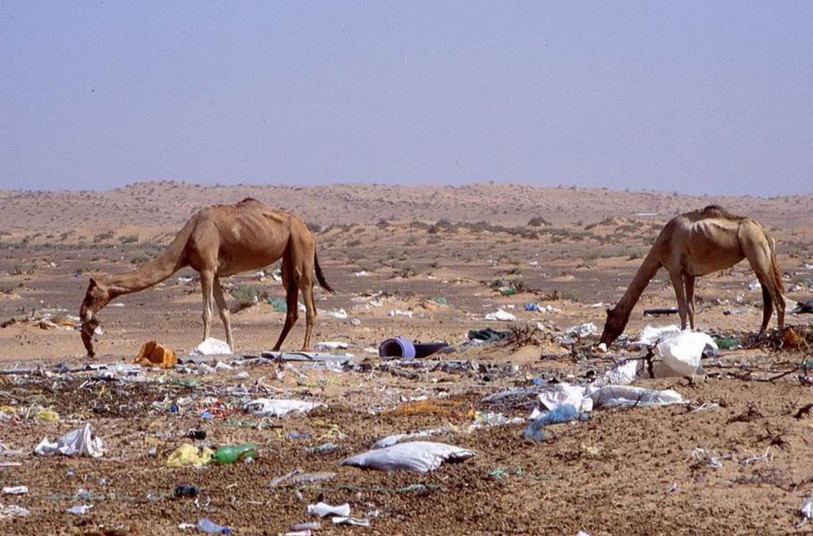 Podle výzkumu, který vedl Marcus Eriksen, zemře zhruba jedno procento velbloudů v Arabském zálivu kvůli pozřeným plastům. Z 30 tisíc uhynulých zvířat mělo 300 velbloudů žaludky a střeva plná plastového odpadu. V mrtvých velbloudech vědci objevili takzvané polybezoáry, útvary vytvořené nestravitelným materiálem, které tvořily především plasty z igelitových sáčků a provazů. Tyto útvary běžně dosahují velikosti basketbalového míče, vědci ale zaznamenali i útvary výrazně větší.