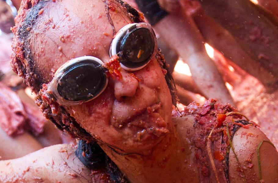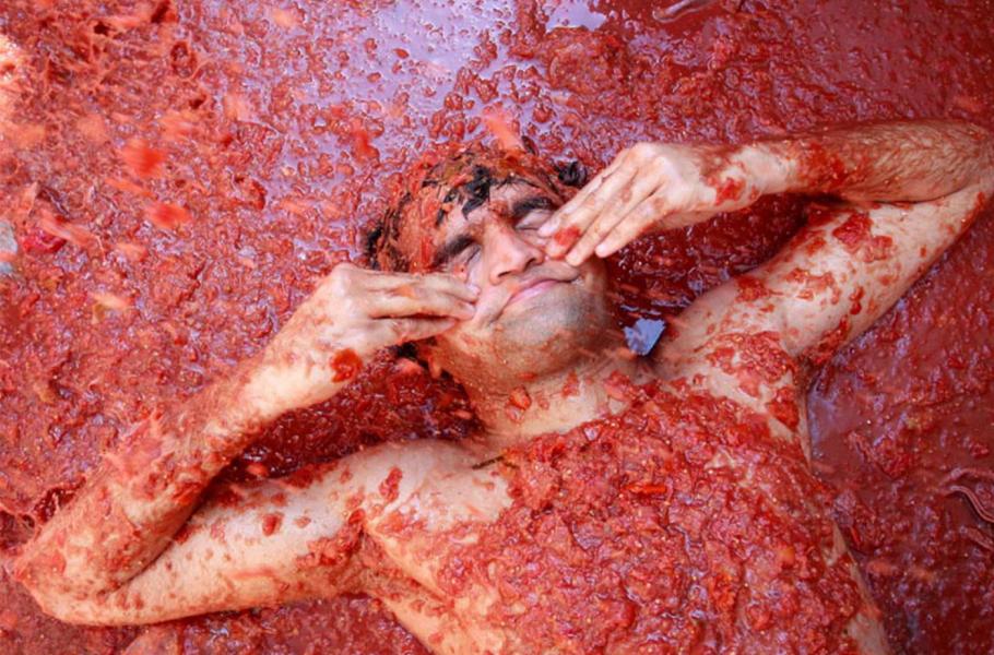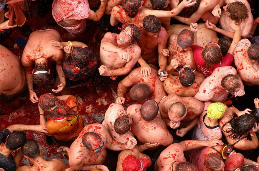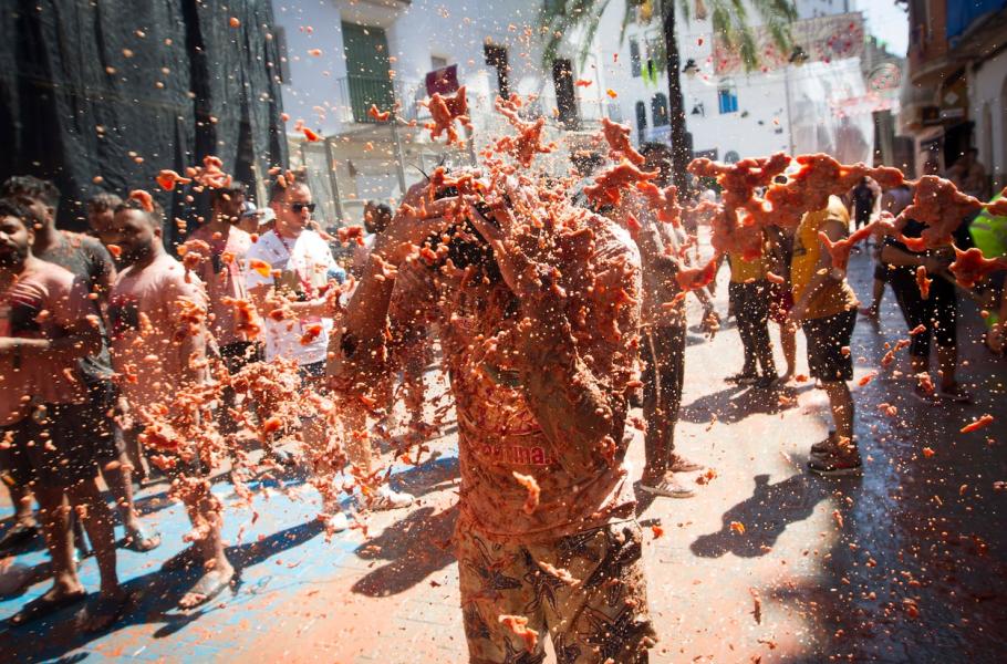 Tisícihlavý dav a ulice zbarvené do ruda, to je každoroční obrázek srpnové slavnosti La Tomatina, odehrávající se ve španělském městečku Buñol nedaleko Valencie.