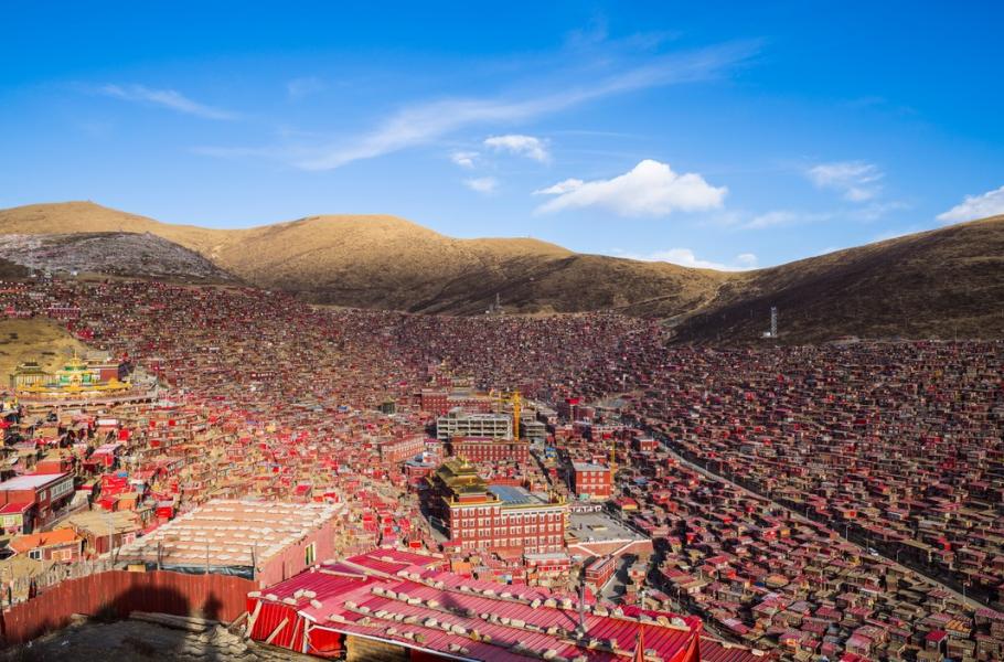 Původně stanový tábor buddhistických mnichů, který chtěla komunistická Čína zničit, se nachází v horách S’-čchuanu, v nadmořské výšce okolo 4 tisíc metrů nad mořem.