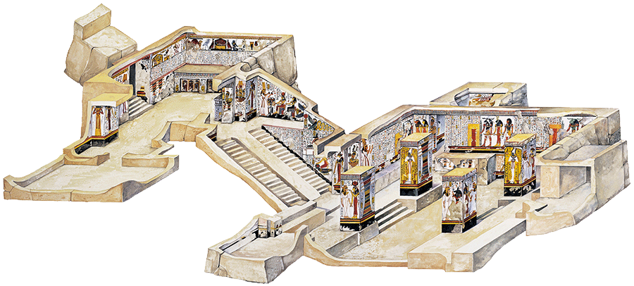 K jiné situaci ovšem dochází v Nefertařině hrobce. Tam malby skutečně oslavují jenom královnu. O jejím pyšném manželovi zde chybí jakákoli zmínka. Pokyny k pracím na této zádušní stavbě vydal Ramesse již v prvních letech své vlády. Nemohl přece dopustit, aby jeho milovaná choť spočinula v nějaké narychlo zbudované komůrce!