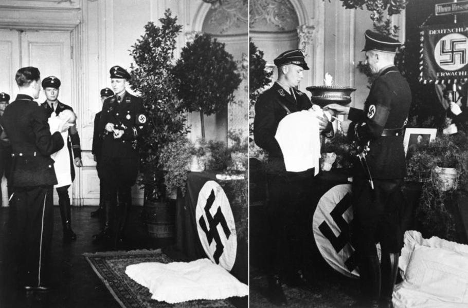 Křest dítěte narozeného v rámci programu, snímek pochází přibližně z let 1936–1937. Vše probíhalo v nacistickém duchu a bez přítomnosti kněze.