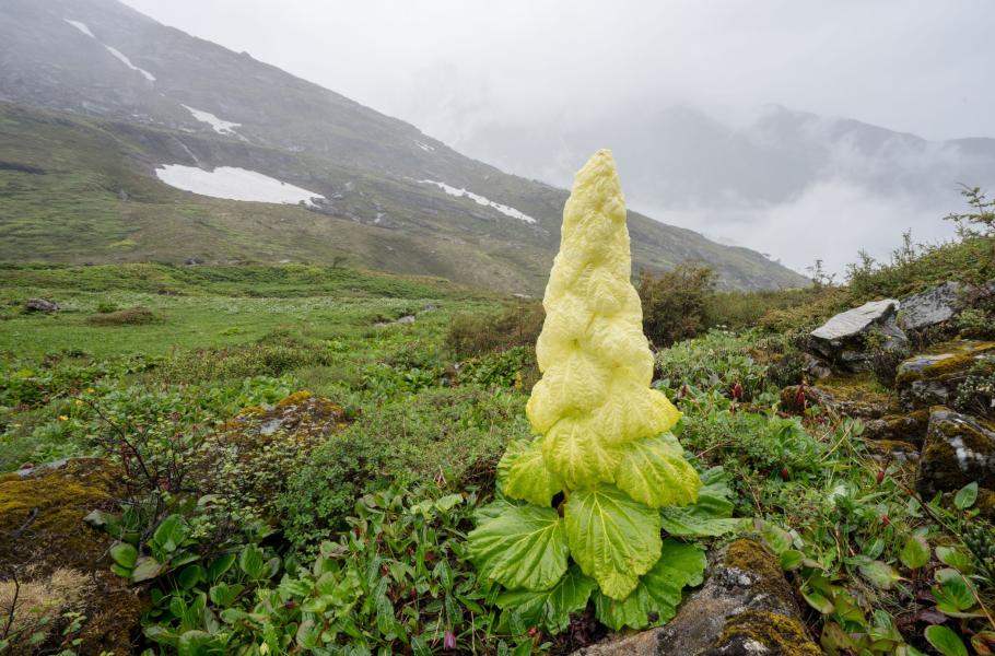 Z přízemní růžice listů vyrůstá nevětvený přímý stonek s velkými okrouhlými průsvitnými listeny s čepelí až 30 cm v průměru. Listeny se směrem vzhůru zmenšují a střechovitě překrývají, pod nimi jsou schované drobné laty květů. Díky tomu jsou květy a vyvíjející se plody chráněny před nočními mrazy a UV zářením a ve dne mají zvýšenou teplotu podobně jako ve skleníku. Po odkvětu se stonek protahuje, listeny usychají a opadávají. Díky tomu se semena mohou šířit za pomoci větru. Stonek je využíván jako zelenina. Mohutná vysokohorská rostlina, která tvoří dominantu luk nad horní hranicí lesa v Himálaji. Má mohutný, až dva metry dlouhý a na řezu žlutý kořen.