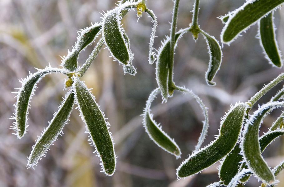 Opylení nenápadných květů jmelovitých rostlin (Viscaceae) zajišťuje hmyz nebo vítr. Semena se šíří buď pomocí ptáků, nebo jsou z plodů vystřelována tlakem zrajícího míšku. Aby se semeno udrželo na větvích hostitelských rostlin, je obaleno lepkavým viscinem. (foto: Wikimedia Commons, gailhampshire, CC BY 2.0)