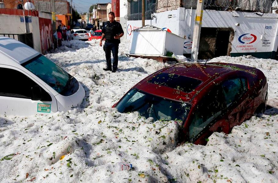 V oblasti západomexické Guadalajary panovala o víkendu třicetistupňová vedra, když se přihnala bouře a část druhého největšího města Mexika během chvilky doslova zmrazila. Do ulic pětimilionové aglomerace proto musela vyjet odklízecí technika.