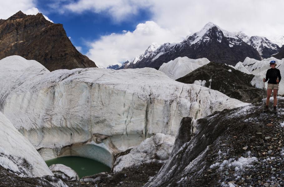 Odhadovat vzdálenosti je zde, v krajině obřích balvanů, suti a ledu mimořádně obtížné. Bez stromů se oči nezachytí žádného měřítka, a tak se zdá, že na druhou stranu to může být pár set metrů. Jenže chyba lávky, údolní dno je široké ke čtyřem kilometrům! Nelehký je i samotný přechod ledovce, jenž je třeba hned u čela překonat. Ledovec je „živý“, a tak se cesta po jeho povrchu mění i několikrát za rok. Hledání pěšinky v bludišti kopečků, kde člověk vidí sotva pár desítek metrů před sebe, obcházení trhlin, potůčků a jezírek doprovází co chvíli zlověstný praskot odněkud z nitra ledovce.