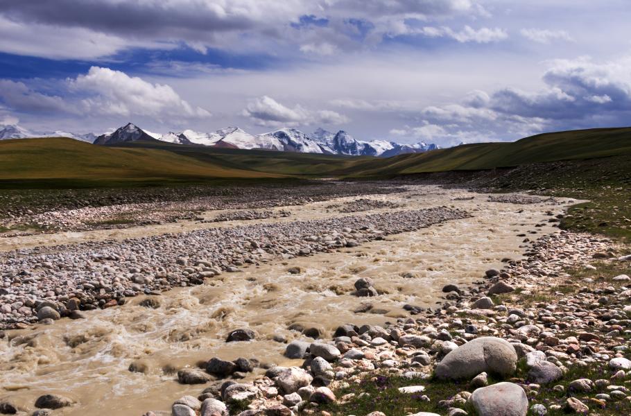 Řeka Sarydžaz, na jejímž břehu leží vojenská základna, je proti dosavadním říčkám „jiné kafe“. Pohled na rozbouřenou špinavou vodu, která pochází z horských ledovců, naznačuje, že pokus o brodění by tady dopadl špatně. Jediný mostek ale leží pár kilometrů dolů po proudu, což nám do nohou přidává zbytečnou desítku kilometrů navíc. K horám už míříme podél řeky Ťuz, kterou pod stejnojmenným sedlem brodíme (silný proud, lehký déšť a voda o teplotě sotva pár stupňů) a stoupáme do místa, které bývá označováno za nejhezčí vyhlídku treku.