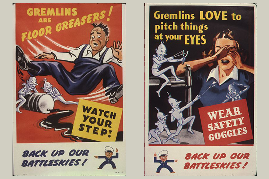 Gremlini si rádi počíhali nejen na piloty, ale také na pozemní personál a dělníky pracující v továrnách leteckého průmyslu. Vznikla proto série varovných plakátů, jež měly zvýšit bezpečnost na pracovišti. První z nich ve volném překladu říká: „Gremlini s oblibou rozlévají olej na podlahu. Dávej pozor, kam šlapeš!“, zatímco druhý praví: „Gremlini lidem rádi házejí věci do očí. Noste ochranné brýle!“