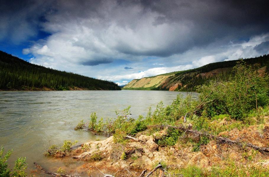 Yukon a krajina kolem něj nás na první pohled uchvátily. Tady ve Whitehorse je řeka ještě čistá, nezakalená bahnem. Na evropské poměry je zároveň velmi mohutná. Hladina se třpytí ve večerním světle a v dálce na druhém břehu se donekonečna rozprostírá zelené moře lesů. Nad vrcholky stromů pak jako útesy vyčnívají skalnaté vrcholky kopců, tu a tam se zbytky sněhu.