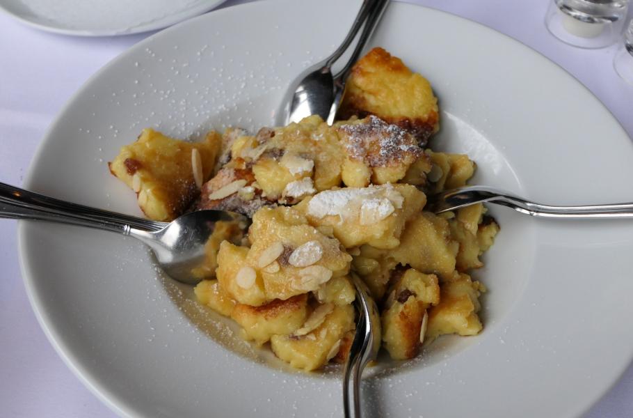 Příběhů o sladké potrhané palačince je tolik jako variant ovoce, které do něj lze zamíchat. Téměř všechny ale vedou k císařské rodině. Podle jedné samotná císařovna Sisi jednou chtěla svému choti připravit palačinku, ale celou ji potrhala. Podle jiné Sisi nikdy nesnědla palačinku celou, jenom kousek, protože prý na ni byla příliš velká a vydatná. Císař Josef proto jednou kuchaři nakázal, aby jí už předem natrhal jídlo na malé kousky. A Sisi to tak překvapilo, že snědla daleko víc, než obvykle! Nebo je snad pravda, že obyčejný selský trhanec nabídl císaři Františkovi během jeho cesty jeden ze sedláků a vídeňští páni si jej jen vylepšili rozinkami v rumu? Možná. Nicméně trhanec nejspíš zůstane doporučovanou a oblíbenou pochoutkou všem příběhům navzdory. (foto: Wikimedia Commons, Dr. Bernd Gross, CC BY-SA 3.0 DE)