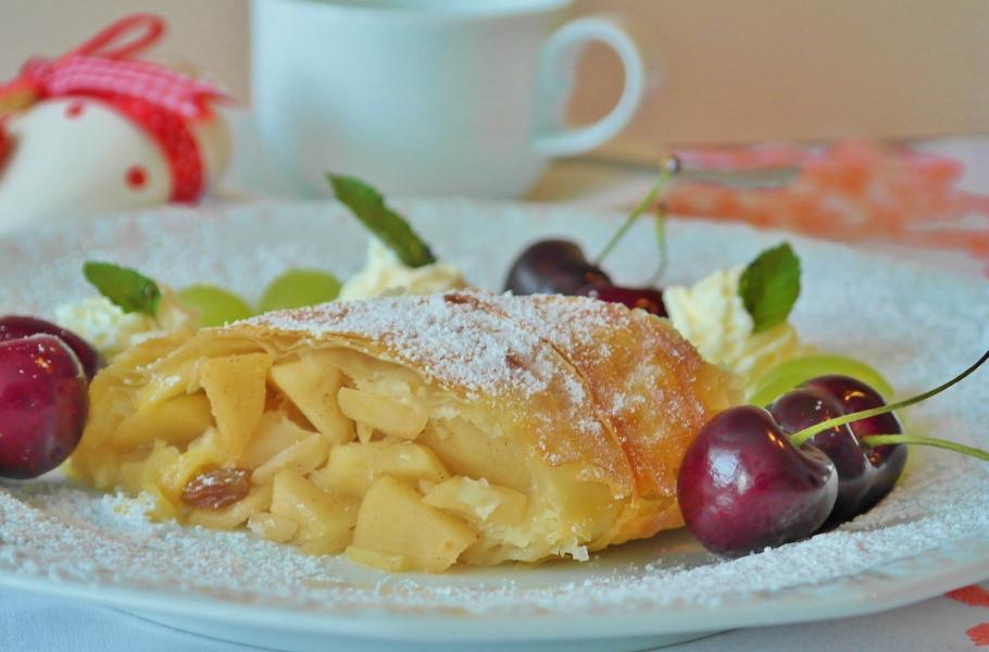 Bojovní osmanští Turci si s sebou na válečné výpravy brávali také své kuchaře, cukráře a pekaře. Jen oni totiž dokázali uvařit a upéct jejich tradiční orientální pokrmy. Jednou ze specialit, která se v našich končinách uchovala až do dnešních dní, bylo pečivo z listového těsta zvané börek. A právě ten v Rakousku jednou naplnili směsí jablek, skořice a rozinek. Dezert, kterému se podle způsobu přípravy začalo říkat Strude = vír se stal mezi lidmi rychle oblíbený. První známý recept na štrúdl pochází už z roku 1696! (foto: Pixabay, RitaE, CC0)