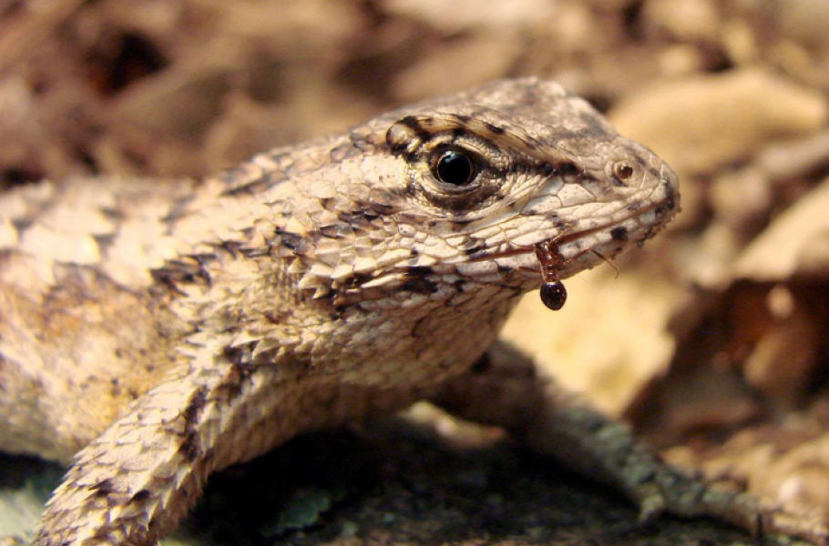 Leguánek stepní s mravenčí pochoutkou. (foto: Langkilde Lab/Penn State, CC BY-NC-ND 3.0)