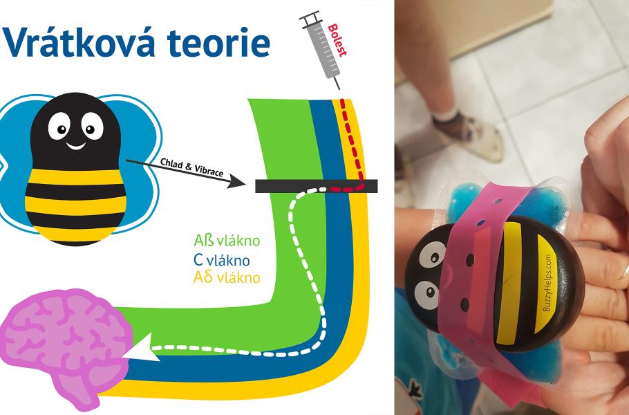 Buzzy® je malý strojek v podobě roztomilého zvířátka s chladivými křídly, který přiložíme přímo na tělo. Pracuje na principu tzv. vrátkové teorie vedení bolesti, což velmi zjednodušeně řečeno znamená, že pokud se mozek soustředí na jakýkoli výraznější vjem, a to je v případě Buzzyho intenzivní chlad nebo vibrace, potlačí vnímání ostatních vjemů včetně bolesti.