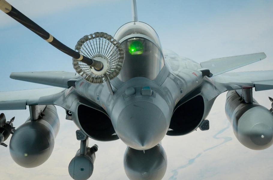 Francouzský víceúčelový letoun Dassault Rafale před zahájením tankování z leteckého tankeru KC-135 během operace nad Mali, kam stroje létaly z Francie přes Alžírsko