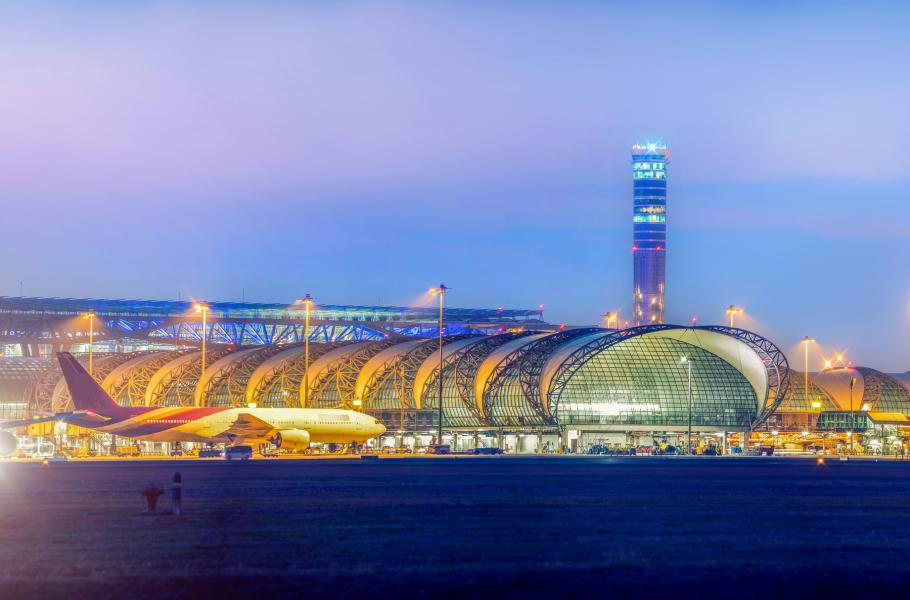 Letiště Suvarnabhumi v Bangkoku je největší vzdušný přístav v Thajsku a jeden z největších na světě. Zaujímá plochu 3 200 hektarů a jen v roce 2017 v něm odbavili 60,9 milionu pasažérů (pro srovnání letiště Václava Havla loni odbavilo asi 15,4 milionu cestujících). Nachází se v něm nejvyšší kontrolní věž na světě, šplhající do výšky 132 metrů a třetí největší terminál světa. Impozantní tvar i barevnou podobu, díky nimž patří toto letiště k nejzajímavějším na světě, má na svědomí německý architekt Helmut Jahn.