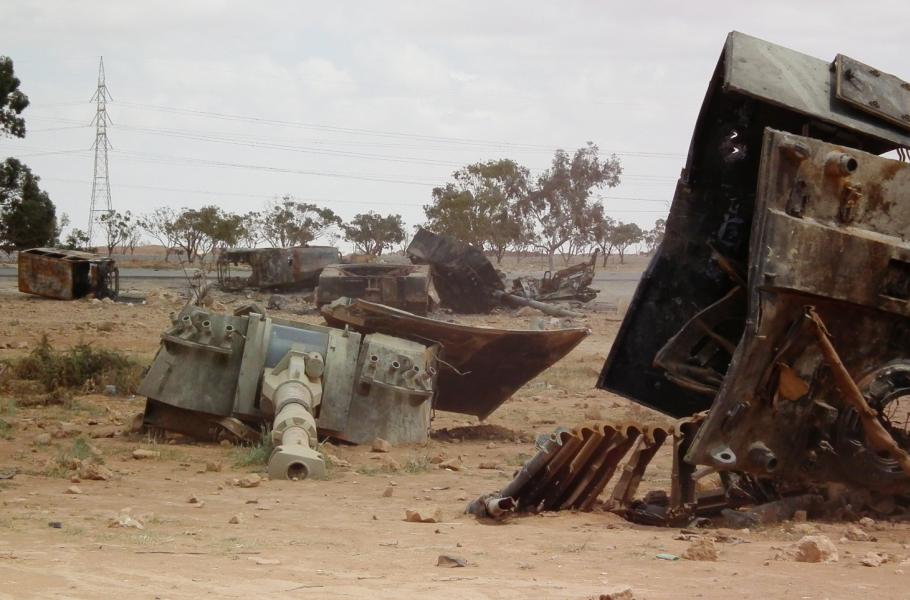 Samohybná houfnice Palmaria vládních sil zničená francouzskými letouny Rafale jihozápadně od Benghází 19. března.