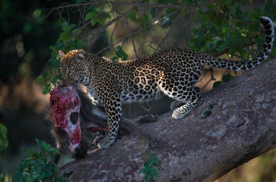 Po dlouholetém snažení konečně přišlo obrovské štěstí a zbožné přání se vyplnilo – na stromě opravdu byl levhart. Šlo o krásnou samici, která sice seděla trochu výš, než bych si představoval, ale věřil jsem, že když budu trpělivý, určitě sestoupí níž. Ze stavu blízkého blaženosti mě vytrhl nový pohyb, tentokrát v úrovni očí – v místech, kde se mohutné větve fikovníku rozdělovaly. Nemohl jsem tomu uvěřit! Z rozsochy stromu mě pozorovalo téměř odrostlé mládě! Mluvit o tom, jaké pocity a zároveň horečnou aktivitu u mě tato jedinečná situace vyvolala, je asi zbytečné. Sledovali jsme každý pohyb obou zvířat. Po chvíli se samice zvedla a já čekal její sestup směrem k mláděti. K mému překvapení ale zvolila opačný směr a začala šplhat do koruny stromu. Teprve pak jsem si všiml proč. V husté koruně visel ve větvích ulovený pavián!