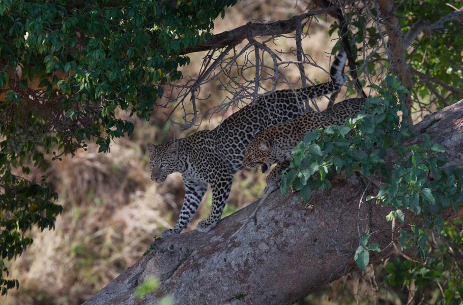 Až po několika týdnech marného čekání se nám podařilo prolomit smůlu. Jednoho rána jsme vyrazili směrem k Taleku, kde jsme předchozího dne pozorovali pářící se lvy. Jelikož jejich milostné hry trvají obvykle tři až čtyři dny, doufal jsem, že se nám lvy podaří znovu najít a v ranním světle pořídit nějaké zajímavé záběry. Křižovali jsme zarostlé břehy řeky, ale po páru ani stopa. V tom jsem na jednom ze starých fíkovníků zaznamenal nějaký pohyb. Nejprve jsem si myslel, že jde pouze o paviány, ale raději jsme se vydali místo zkontrolovat. Ve chvíli, kdy jsme se k mohutnému fíkovníku blížili, mě napadlo, že jestli u Taleku existuje ideální místo pro focení levhartů, je to právě tento strom. Fíkovník vyrůstal z písečné pláže v korytě řeky hluboko pod námi a některé jeho větve tak byly přímo v úrovni našich očí. Navíc nám terén dovoloval přiblížit se k nim na pouhých několik metrů.