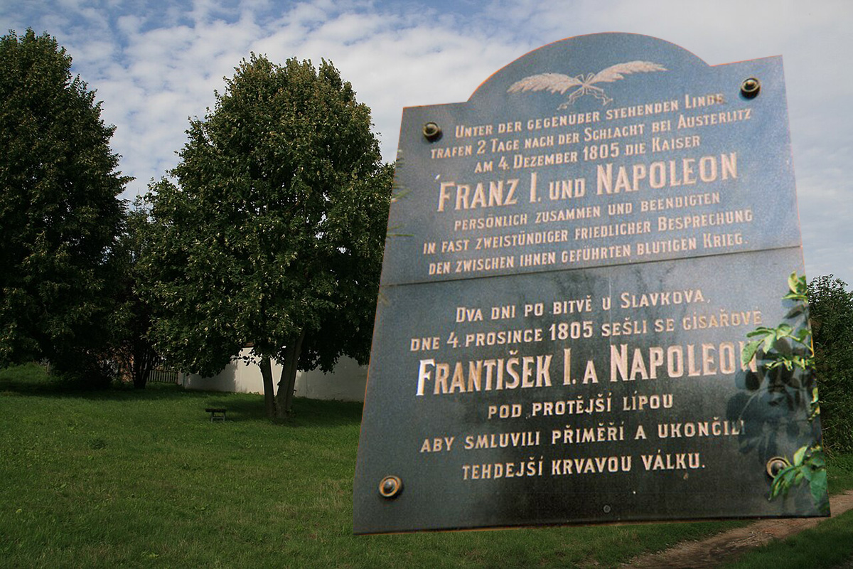 Památný strom už připomíná jen stará pamětní deska na zdi nevzhledné a krabicové hospodářské budovy toho, co zbylo z vodního mlýna, řečeného Spálený. „Dva dny po bitvě u Slavkova dne 4. prosince roku 1805 sešli se císařové František II. a Napoleon pod protější lípou, aby smluvili příměří a ukončili tehdejší krvavou válku.“