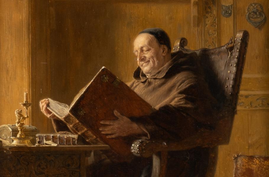 Knihy byly určeny k hlasitému slabikování. Texty tudíž postrádaly mezery i čárky. (ilustrace: Wikimedia Commons, Eduard von Grützner, CC0)
