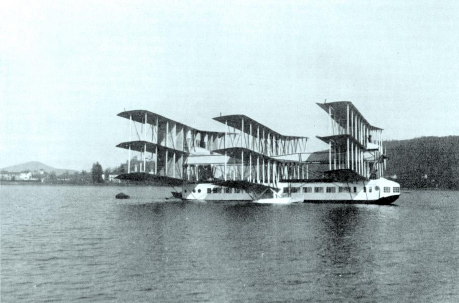 Prototypu létající lodi s devíti křídly se přezdívalo Noviplano či Capronissimo a původně mělo jít o transatlantický dopravní prostředek. Navrhl jej italský inženýr Gianni Caproni a dal mu do vínku rovnou osm motorů. Na první testovací let vyrazil stroj nad jezero Maggiore a bez problémů také přistál. O dva dny později však krátce po startu havaroval a rozbil se o hladinu; další škody pak utržil při nešetrném vytahování na souš. Na rekonstrukci nakonec nedošlo kvůli nedostatku financí. (foto: Wikimedia Commons, CC0)