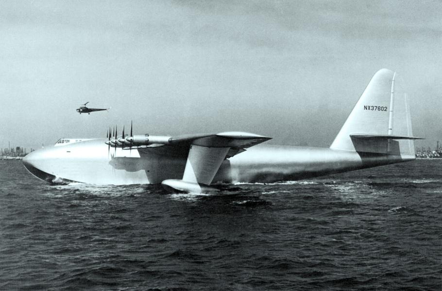 Hughes H-4 Hercules měl za druhé světové války pomáhat s dopravou přes Atlantik, ale v průběhu globálního konfliktu se jej nepovedlo dokončit, a do vzduchu se tak vznesl až po jeho skončení. Válečná materiální omezení se podepsala mimo jiné na konstrukci trupu, který pokrývalo dřevo. Od kritiků si proto stroj vysloužil přezdívku „smrková husa“, ačkoliv byl takřka celý z břízy. Nakonec letěl pouze jednou, načež se od projektu upustilo. Jediný postavený exemplář je dnes k vidění v oregonském Evergreen Aviation & Space Museum. (foto: Flickr, San Diego Air and Space Museum Archive, CC0)