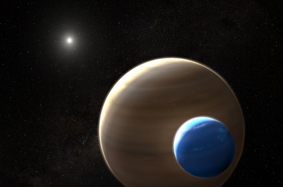 Jedním z nejžhavějších kandidátů na exoměsíc je objekt označovaný jako Kepler-1625b-i, který zřejmě obíhá exoplanetu Kepler-1625b v souhvězdí Labutě. (ilustrace: NASA, ESA, L. Hustak, CC BY-SA 4.0)