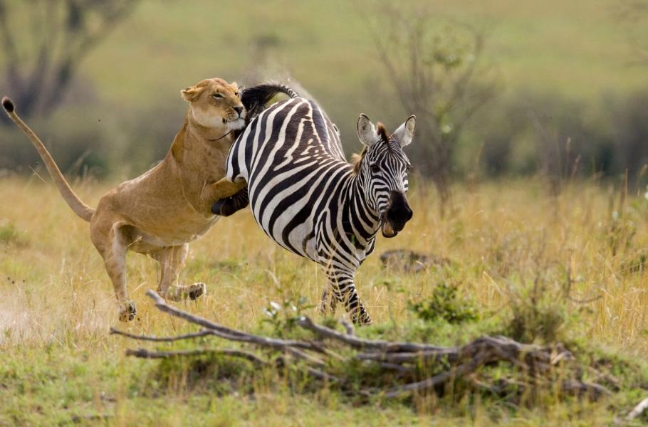 Lvi během dne spí a loví buď v noci, nebo brzy ráno. Když se ale naskytne vhodná příležitost, nemají problém pustit se do lovu klidně uprostřed dne. Jejich nejoblíbenější obětí jsou antilopy, gazely a zebry. Vyhlédnutá kořist je však většinou rychlejší než predátoři, takže lvi se připlíží na co nejbližší vzdálenost a vyrážejí na (v ideálním případě) nic netušící oběti. Dvě věci hrají v prospěch lvů. Jednak fakt, že se dokážou skutečně výborně skrývat a trpělivě přibližovat až do posledního okamžiku. Za druhé se dá říct, že lovení býložravci jsou sice rychlí, ale nejsou natolik bystří, aby je mazaný lovec neošálil. V tomto případě byla poklidně se pasoucí zebra skolena dřív, než se stačila skutečně rozběhnout.