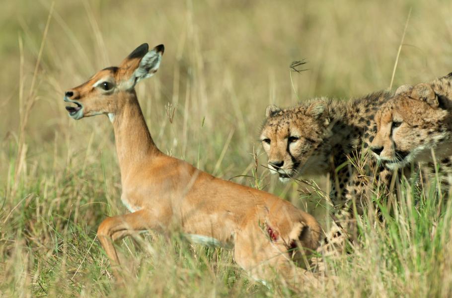 Je dobře známé, že gepardi jsou nejrychlejšími pozemskými běžci. Na krátké vzdálenosti kolem 500 metrů dokážou vyvinout rychlost až kolem 115 km/h. Gepardi se na začátku lovu snaží co nejvíce přiblížit vyhlédnuté kořisti (na cca 10–30 metrů) a v dostatečně malé vzdálenosti vyrazí. Ze stavu nehybnosti na „stovku“ pak umí zrychlit během tří sekund. Lov trvá maximálně minutu, protože bleskurychlý běh je pro predátora nesmírně energeticky namáhavý. Jestliže během této doby gepard svou kořist neskolí, musí pronásledování vzdát a odpočinout si. V 50 % případů jsou ovšem tyto kočkovité šelmy úspěšné. Než se však ze zvířete stane zkušený lovec, musí prodělat „učednická léta“. Na snímku jsou gepardí sourozenci, kteří se na malé impale učí základním loveckým technikám.