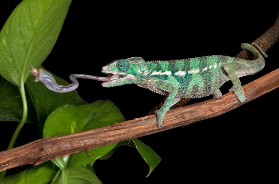 Loveckým nástrojem chameleonů je jazyk, který dokážou velkou rychlostí doslova vystřelit z úst a chytit oběť na jeho špičku. Jazyk je na konci rozšířen a má silně lepkavý povrch. Navíc má zvláštní kruhový sval, který se při kontaktu s kořistí dokáže stáhnout a vzniklý podtlak společně s lepivostí zabrání ztrátě uloveného sousta. Jazyk je dlouhý bezmála stejně jako tělo chameleona a specializovaná měření odhalila, že z úst jej zvíře vymrští během šestnáctiny sekundy. Bleskurychlý pohyb není lidské oko ani schopné zachytit.