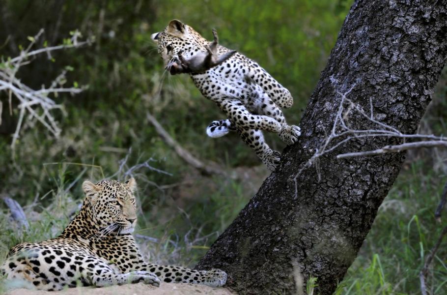 Levharti mají pevně daná teritoria a na rozdíl od mnoha jiných predátorů se za zvěří nepřemísťují. To jim poskytuje možnost dostatečně se na daném území „zabydlet“. I proto se tento malý levhart pod dohledem své matky nebojí dovádět s čerstvě ulovenou promykou.