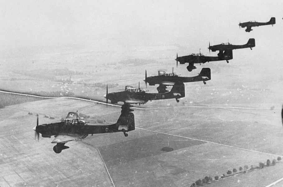 Stuky nad Polskem: Zkraje druhé světové války německé vojenské letouny představovaly absolutní světovou špičku, zde střemhlavé bombardéry Ju 87 Stuka během polské kampaně, září 1939.